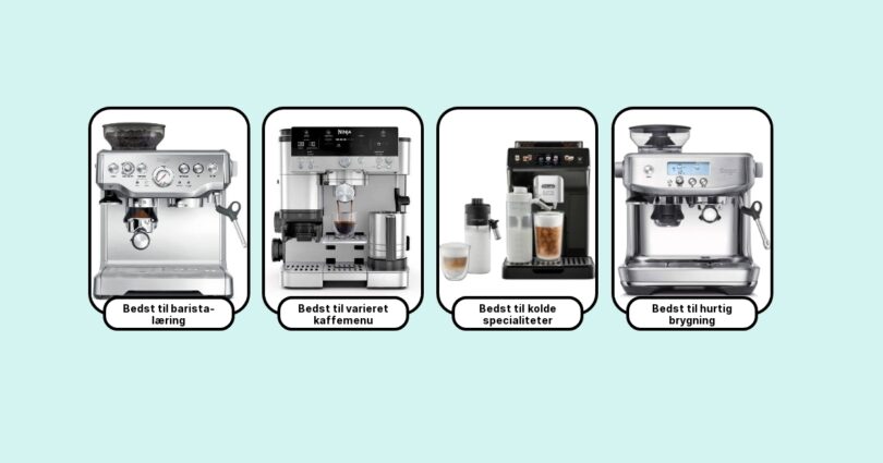 Min egen favorit er Sage Barista Express til semiautomatisk brygning, og DeLonghi Dinamica hvis du ønsker fuld automatik. Begge leverer fantastisk espresso og er nemme at rengøre. For nybegyndere er DeLonghi Dedica et godt, kompakt valg. Hvis du vil have noget helt unikt, så prøv en Rocket Appartamento – italiensk håndværk i verdensklasse.