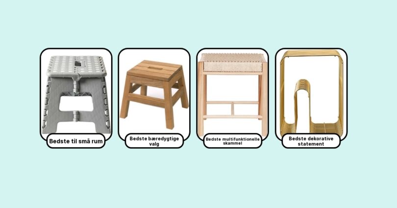 Hvis jeg skal pege på syv uundværlige skamler, bliver det en blanding af klassiske og innovative modeller: 1. IKEA Bekväm, 2. Hay Little Nobody, 3. by KlipKlap KK 3 Fold, 4. HAY About A Stool, 5. Ferm Living Little Grib, 6. Trip Trap Kids Step Stool, 7. KAY Bojesen træskammel. De er alle testet og elsket for hver deres kvaliteter – og jeg ville ikke tøve med at anbefale dem til både familier, designentusiaster, og dig der sætter pris på håndværk i topklasse.